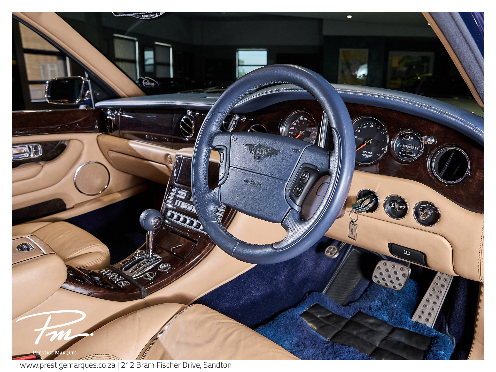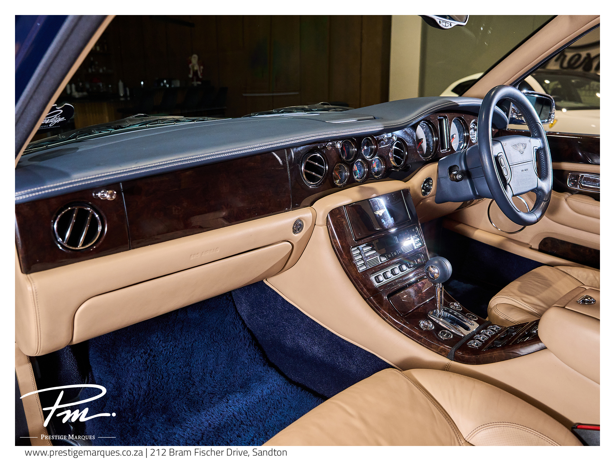 • Blue and Camel Leather Interior with contrast stitching