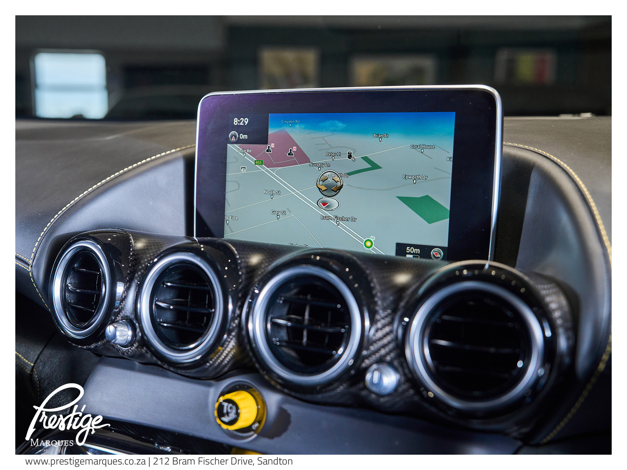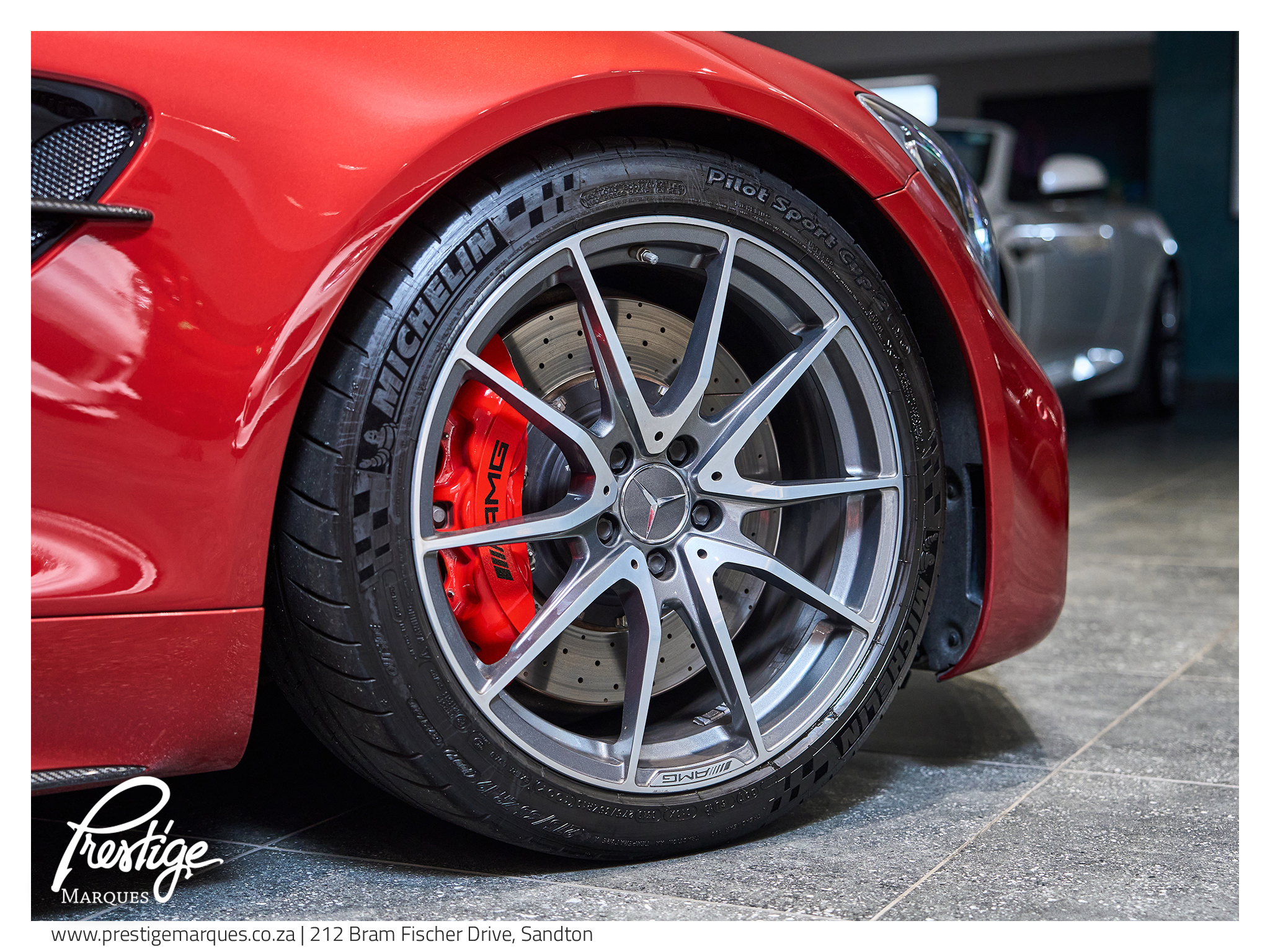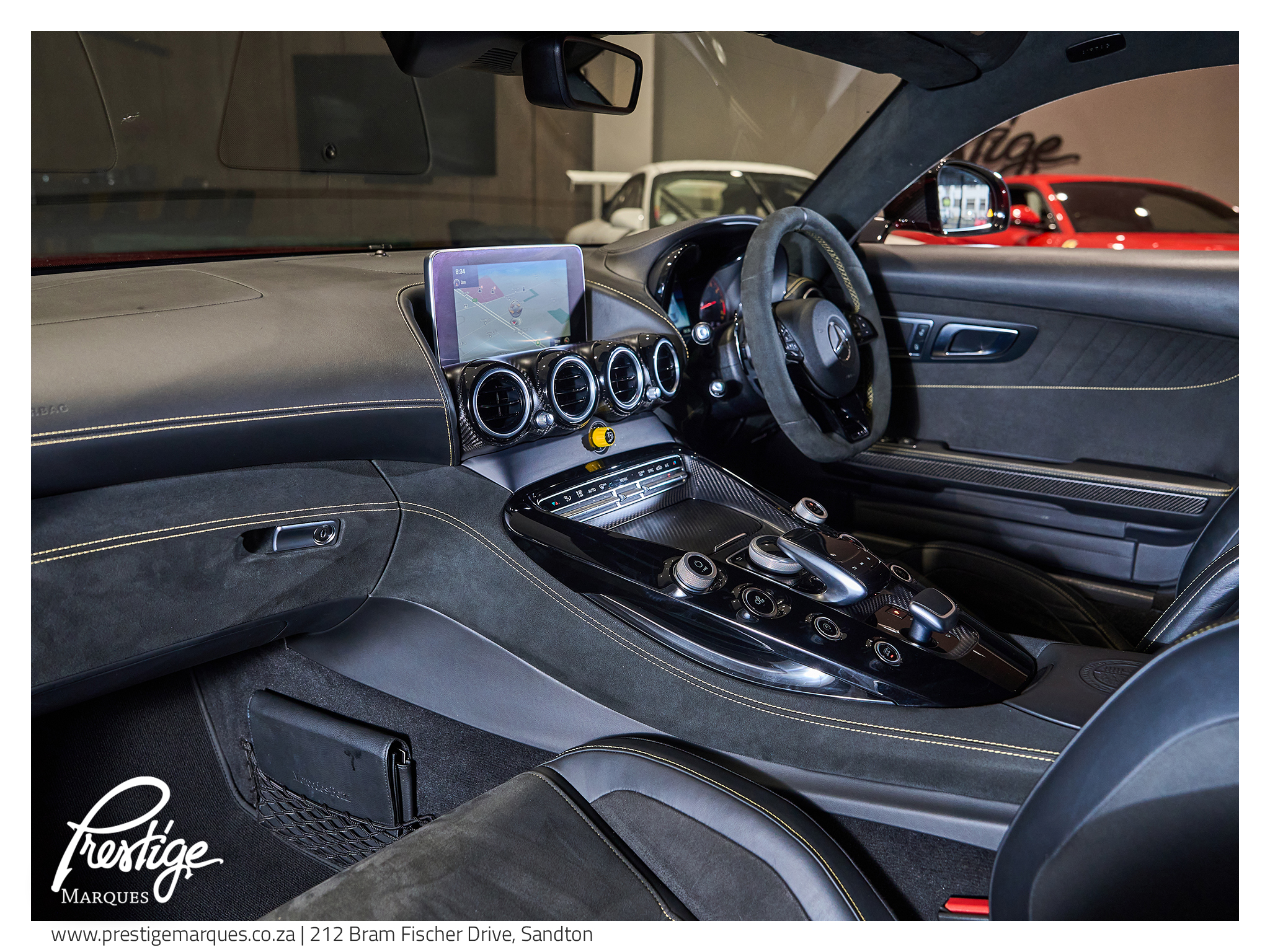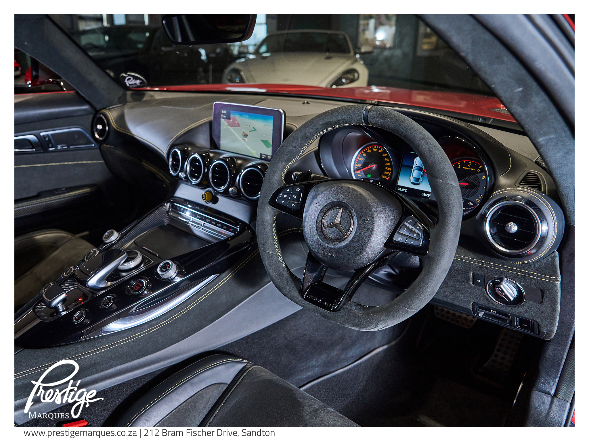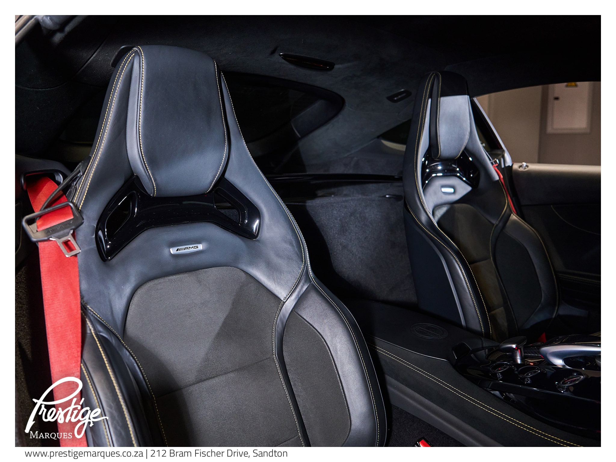Inside, the cabin blends motorsport intent with luxury craftsmanship. AMG Performance bucket seats with yellow stitching, red seatbelts and carbon fibre interior trim surround the driver in a cockpit designed for focus and engagement, while features such as Burmester surround sound, navigation and heated memory seats ensure comfort is never compromised.